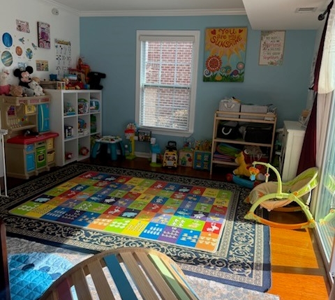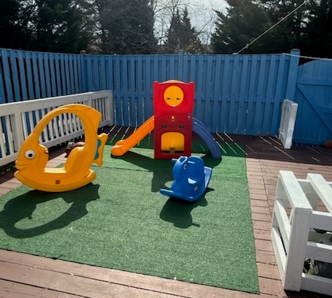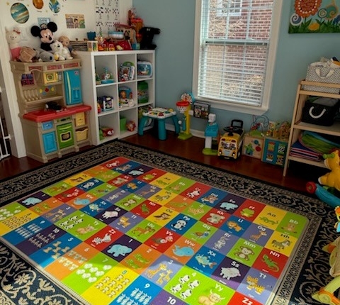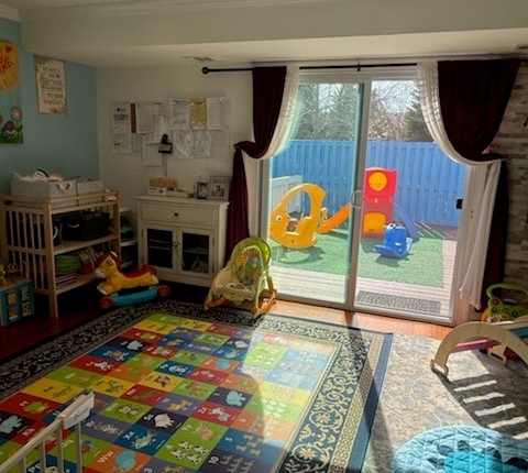 Siham lives in a spacious townhouse.  She uses her entry level for play meals and naps. She also has childproofed her kitchen for mealtimes. She has a backyard perfect for sitting outside for snack time or relaxing while reading books. Right behind her yard is an open area perfect for walks, running around etc.
